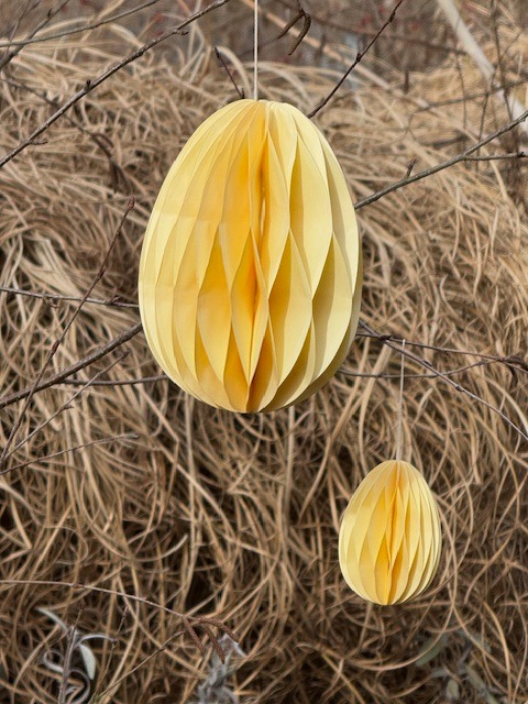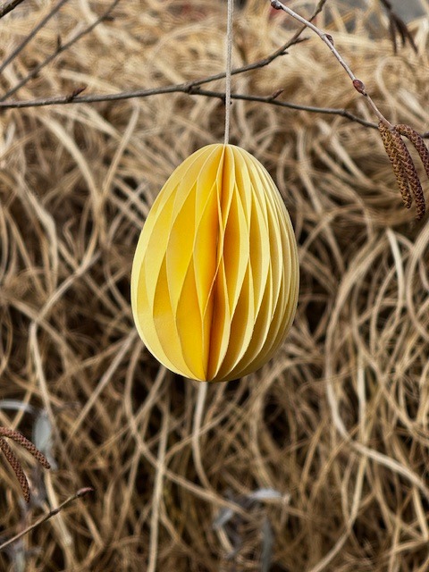 Skládací papírové vejce k zavěšení, žlutá barva. Zasíláme ve složeném stavu, vejce se rozloží a spojí pomocí oboustranné lepicí pásky, která je součástí vajíčka.