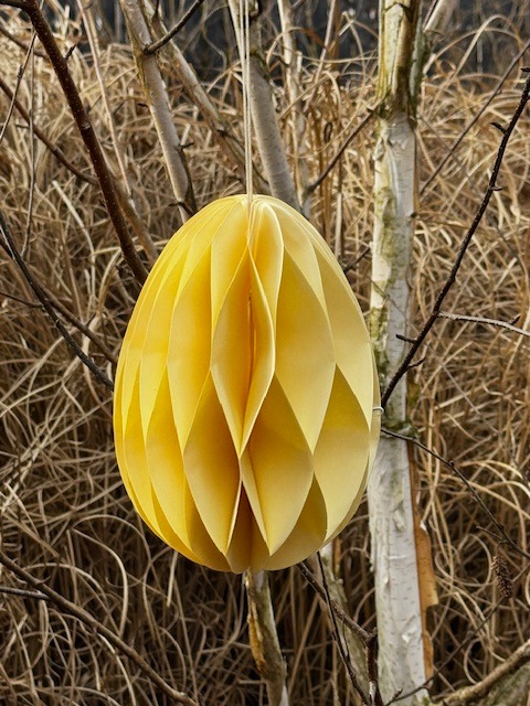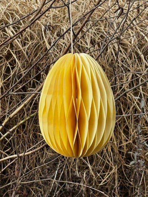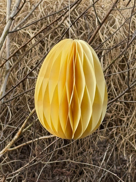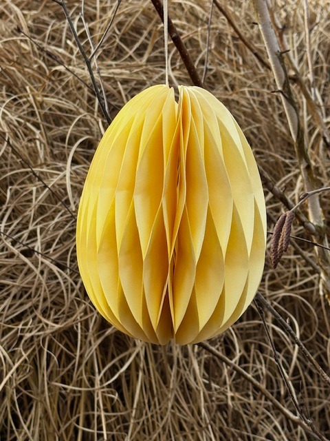 Skládací papírové vejce k zavěšení, žlutá barva. Zasíláme ve složeném stavu, vejce se rozloží a spojí pomocí oboustranné lepicí pásky, která je součástí vajíčka.